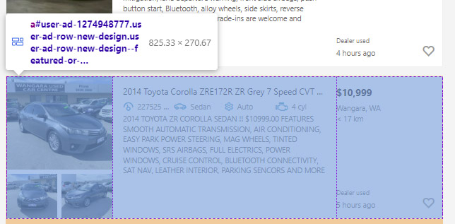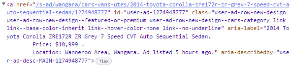 Going back to a web browser and inspecting elements on the search results page, we can see that each advert is a link.